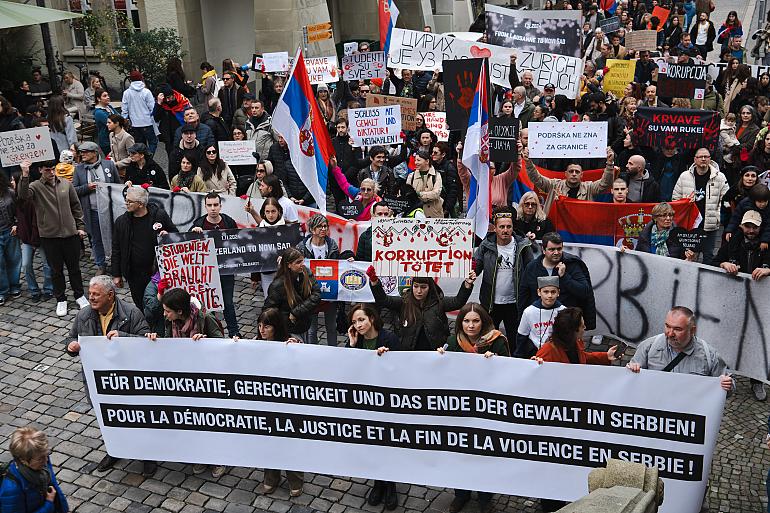 Après les discours d’ouverture, le cortège a défilé pendant environ une heure dans les rues du centre de Berne. Les participants portaient des banderoles en allemand, en français et en serbe, la principale proclamant : « Pour la démocratie, la justice et la fin de la violence en Serbie. »