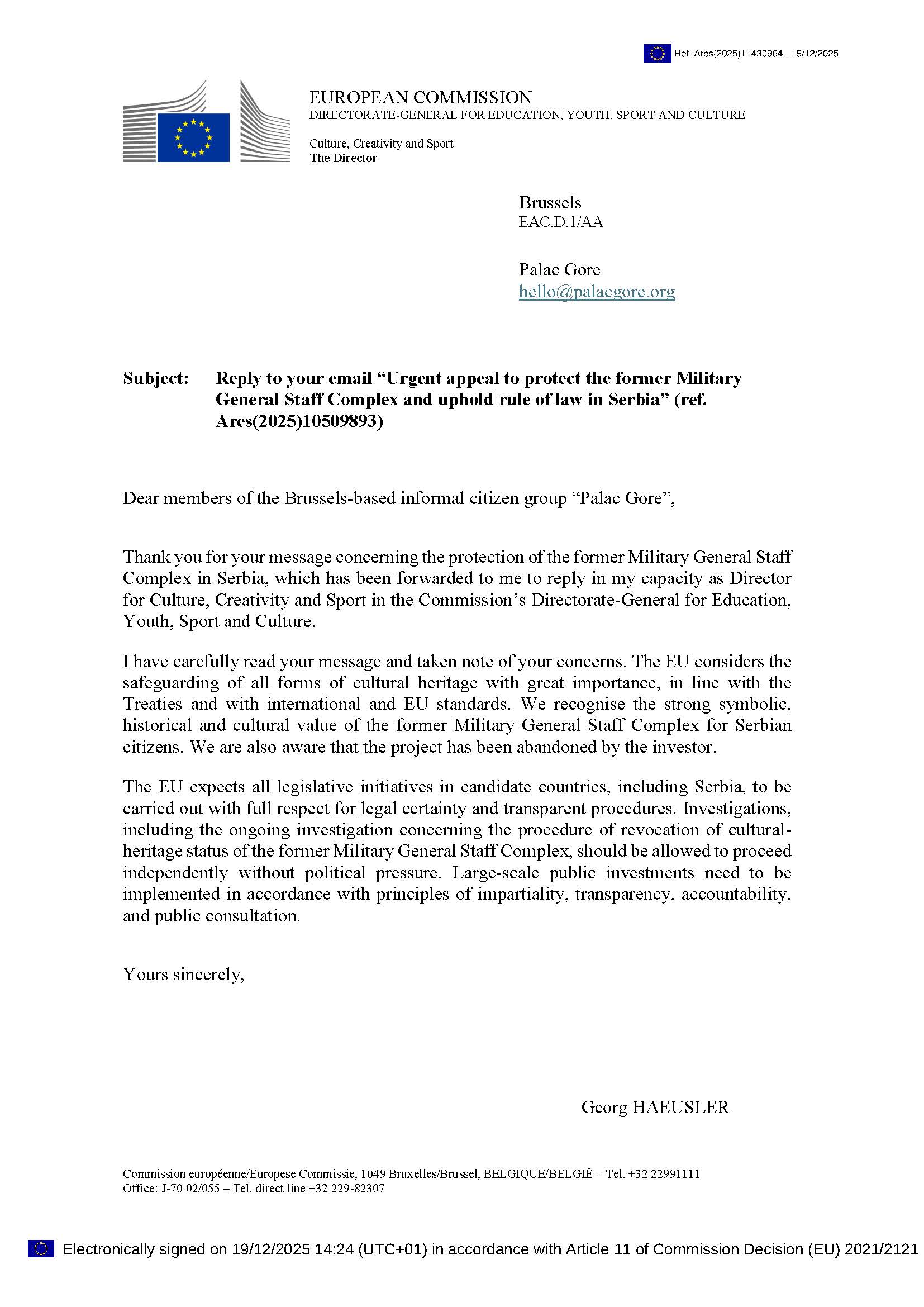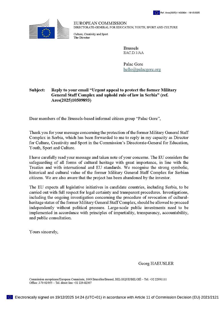 Georg Haeusler, de la Commission européenne, répondant aux appels de Palac Gore — une initiative de la diaspora serbe basée à Bruxelles — a adressé un avertissement d’une rare fermeté : les modifications législatives doivent respecter la sécurité juridique, et les enquêtes sur la révocation du statut patrimonial doivent se dérouler « de manière indépendante et sans pression politique ». C’était la première fois qu’un responsable européen reconnaissait par écrit la gravité de la situation.