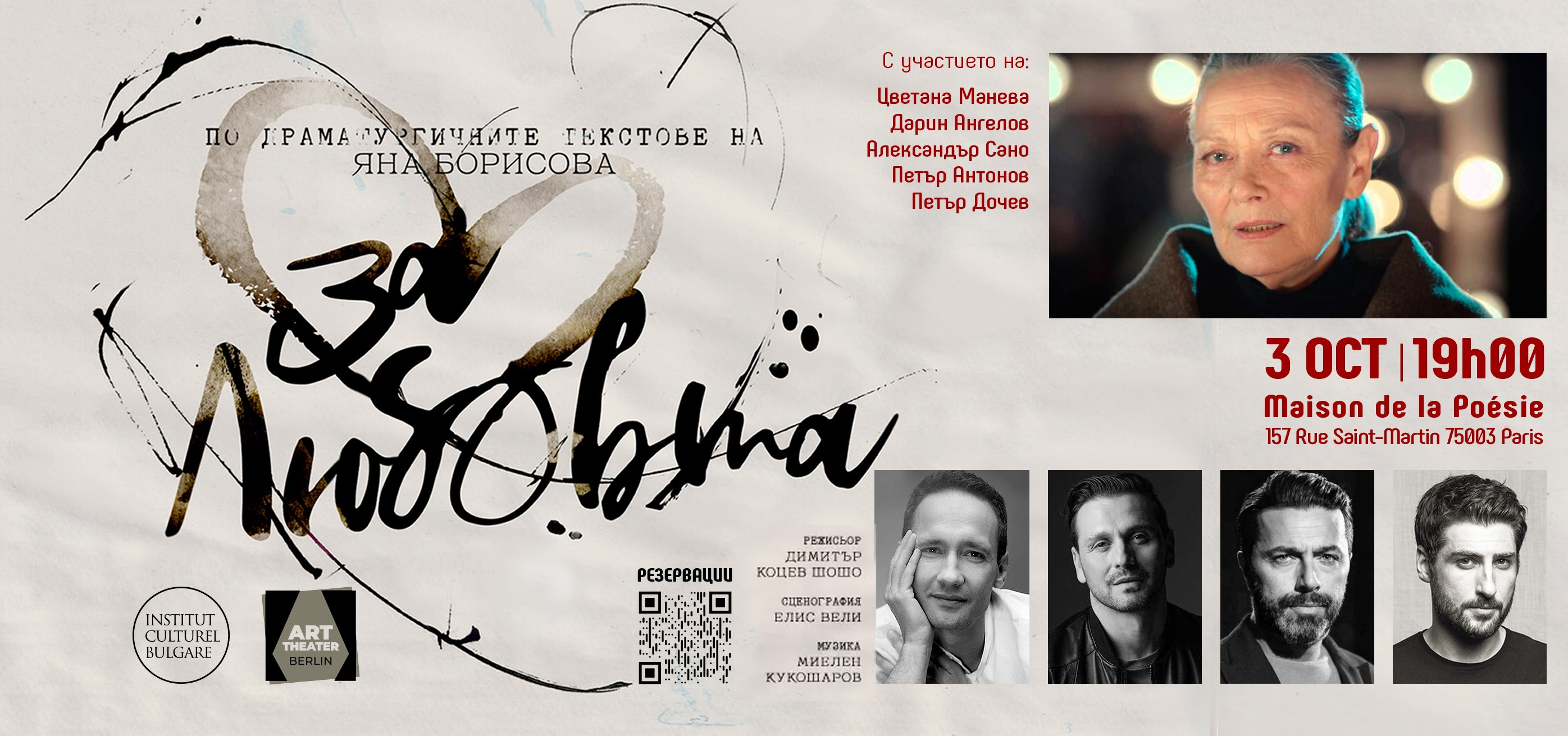 Nous avons l’immense plaisir de vous annoncer que la grande actrice bulgare Tsvetana Maneva, accompagnée des acteurs bien-aimés du public Darin Angelov, Alexander Sano, Petar Antonov et Petar Dochev, sera en représentation à Paris avec le spectacle « Pour l’amour… ».