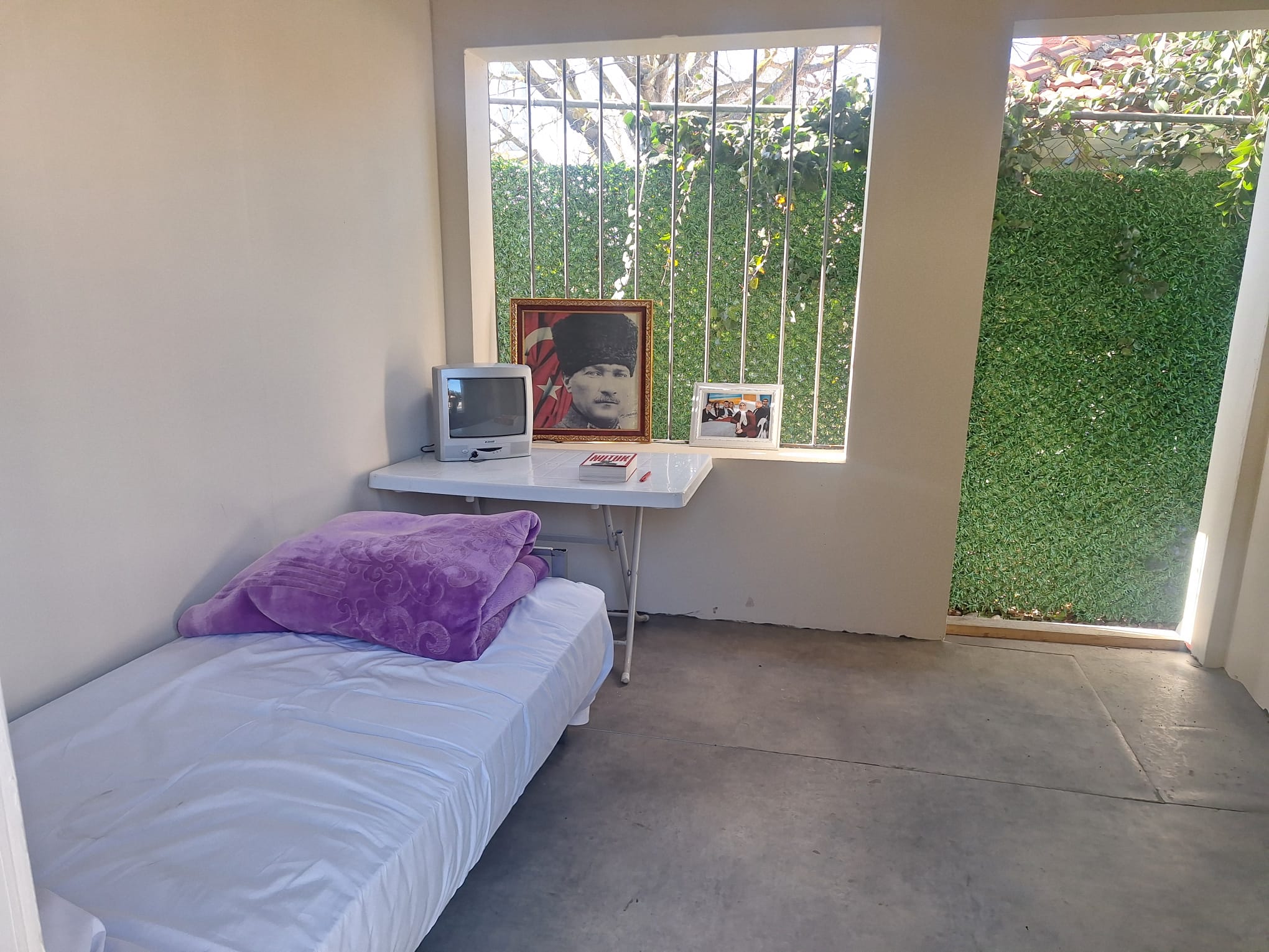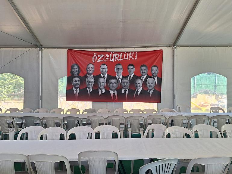 À quelques centaines de mètres du tribunal, l’équipe du maire d’Istanbul a mis en place un « centre de soutien ». S’y trouve notamment une grande tente, où les familles des accusés peuvent se retrouver. Sur le chemin, des fanions du CHP flottent au vent, ainsi qu’une banière rouge avec le visage d’Ekrem İmamoğlu et treize autres collaborateurs détenus. À l’entrée, une réplique de la cellule du maire a été récréé en grandeur nature, avec un lit, une petite télévision, une photo de sa famille et un portrait d’Atatürk, le fondateur de la République turque.